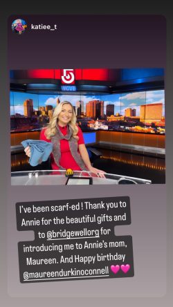During the gala, emcee Katie Thompson chatted with Maureen about this passion of Annie’s – and Katie recently was surprised by the gift of two scarves from Annie, as well as a cute hand-knit stuffed animal for her daughter Brynn!